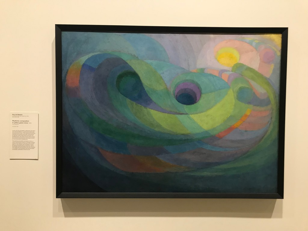 From my perspective, Green Minor represented a visualised journey. My tutor, Michael, explained this artform may have been consequent to the shellshock experienced by Australian soldiers in World War I. The circular movement of the painting indeed felt as though I were being shuttled from a dark abyss to warm hope. It appears to me almost a slippery-dip of emotion, tunnelling from dark shades of violet and indigo, hurtling toward an oval of lime green and canary yellow. Amongst it all is a hazy green neutrality. The rhythm and motion of this painting cannot be denied, and I wondered at the artist’s ability to see music in colours.